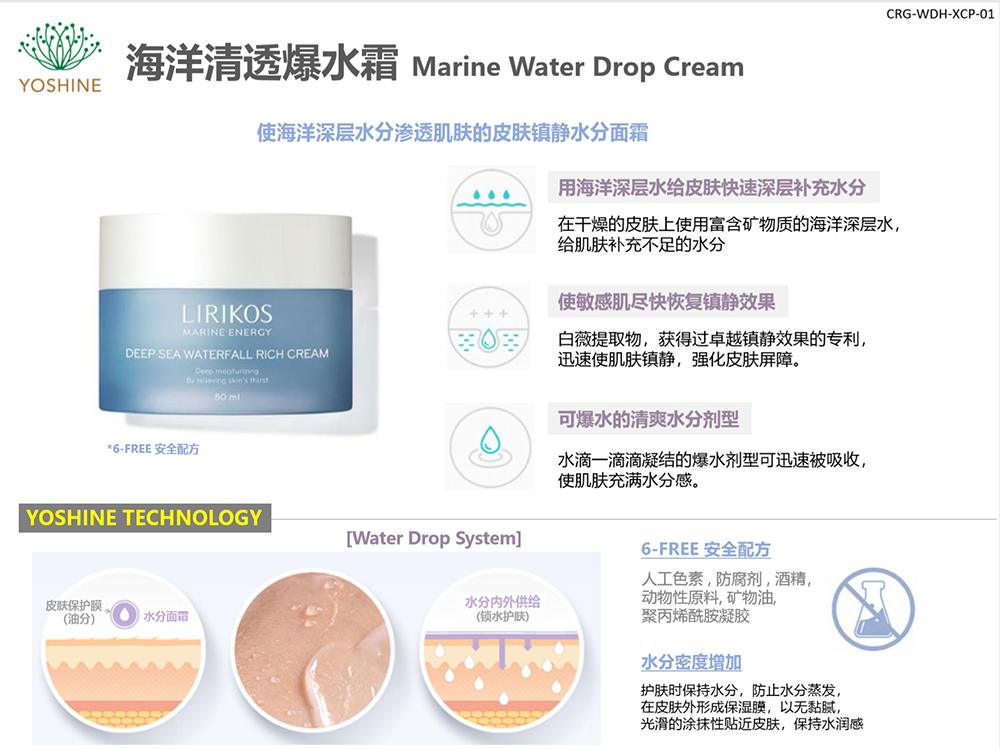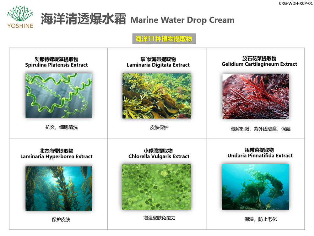 海洋清透爆水霜:含海洋11種植物提取物,安全-無(wú)防腐劑配方,使海洋深層水分滲透肌膚的皮膚鎮(zhèn)靜水分面霜