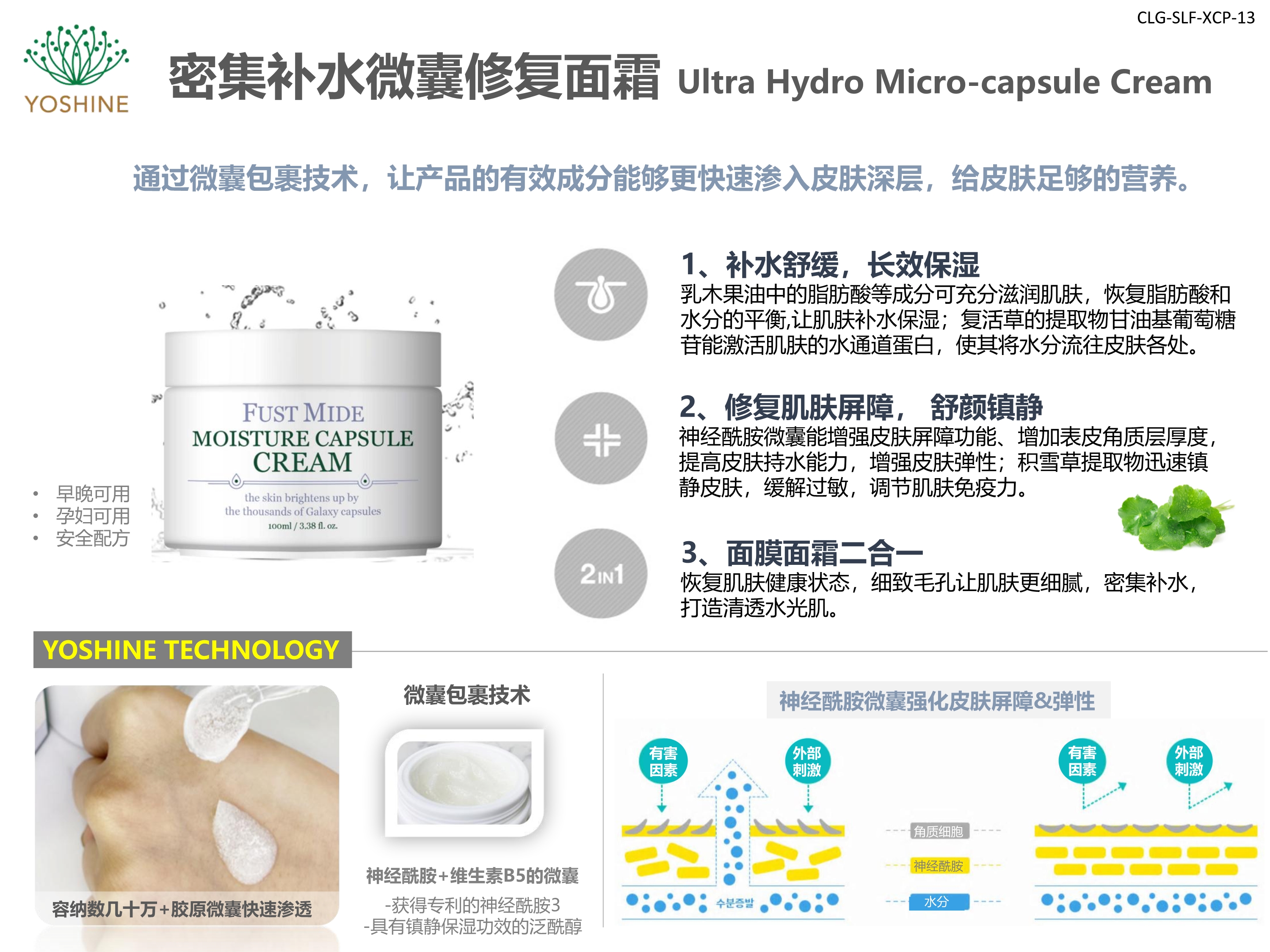 神經(jīng)酰胺微囊能增強(qiáng)皮膚屏障功能、增加表皮角質(zhì)層厚度,提高皮膚持水能力,增強(qiáng)皮膚彈性;積雪草提取物迅速鎮(zhèn)靜皮膚,緩解過敏,調(diào)節(jié)肌膚免疫力。